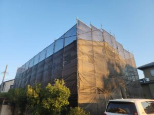 着工当日は足場を架設し、メッシュシートを張っていきます。