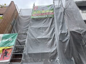 着工当日は足場を架設し、メッシュシートを張っていきます。