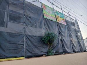 着工当日は足場を架設し、メッシュシートを張っていきます。