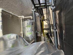 着工当日は足場を架設し、メッシュシートを張っていきます。