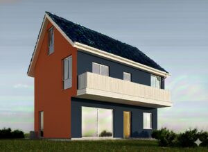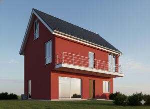 真っ赤の外壁に白のラインを入れた家 → 遠目から見ると派手で落ち着かない印象に。