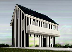 真っ赤の外壁に白のラインを入れた家 → 遠目から見ると派手で落ち着かない印象に。