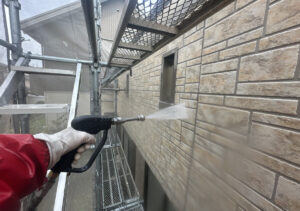 足場の翌日、高圧洗浄を行い長年の汚れを洗い流していきます。