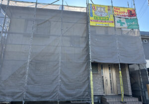 着工当日は足場を架設し、メッシュシートを張っていきます。