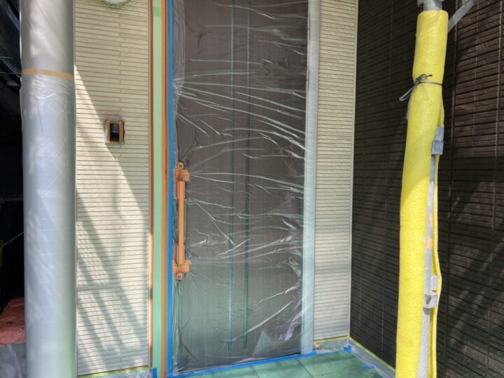 塗装しない所や塗料が付着してはいけない所をマスカー等を使用し保護します。養生②