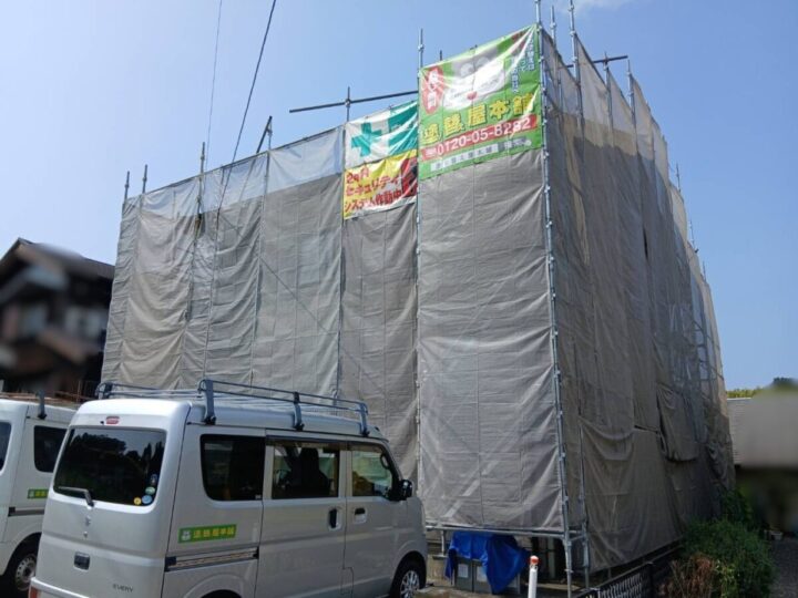 安全や周りへの高圧洗浄時の水や塗料の飛散防止の為足場を架設し養生ネットでお家を囲います。高圧洗浄①