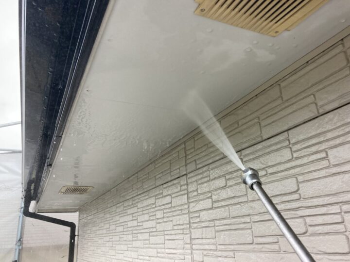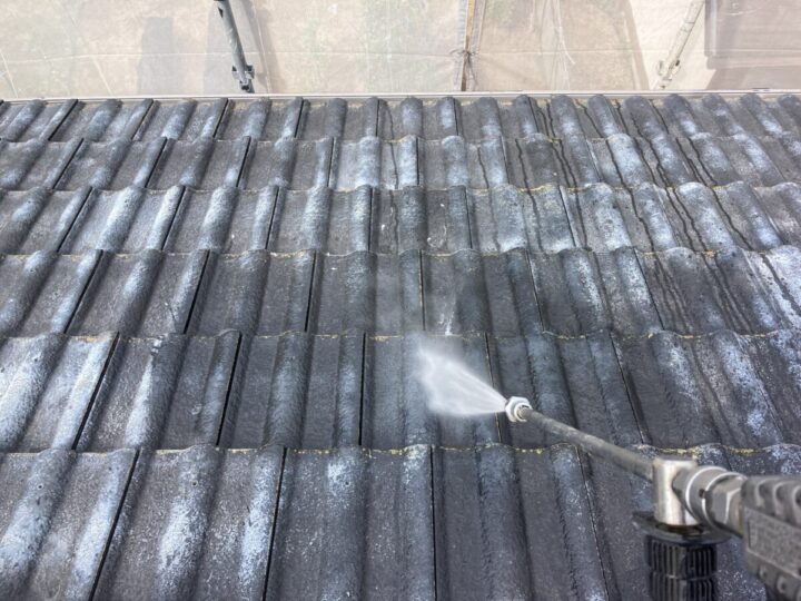 付着した汚れ・劣化塗膜・コケ等を除去し下地をキレイな状態にすることで、新しい塗料をしっかり定着させます。高圧洗浄②