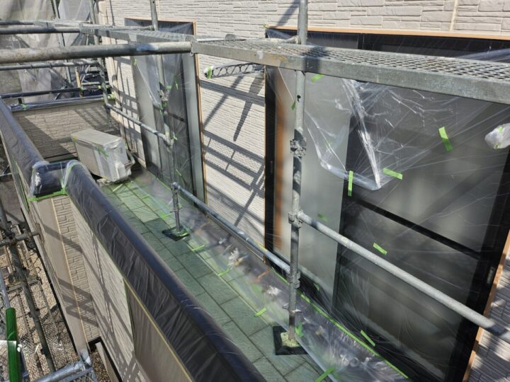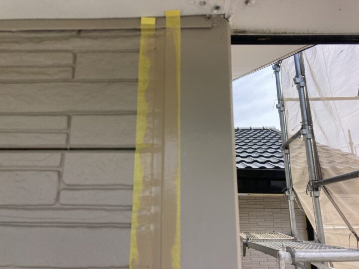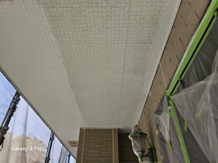 塗装しない箇所や塗料が付着してはいけない所をマスカー等でしっかり保護します。軒天 1回目塗布