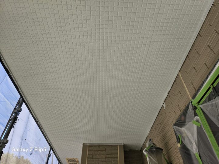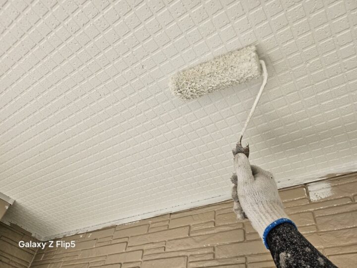 ケンエースを塗布し2度塗りで仕上げます。軒天2回目塗布