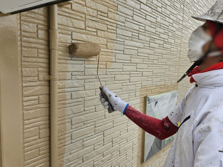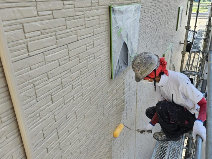 塗料の性能を発揮させ長持ちさせる為に必要な膜厚を中塗りで付けます。外壁中塗り後