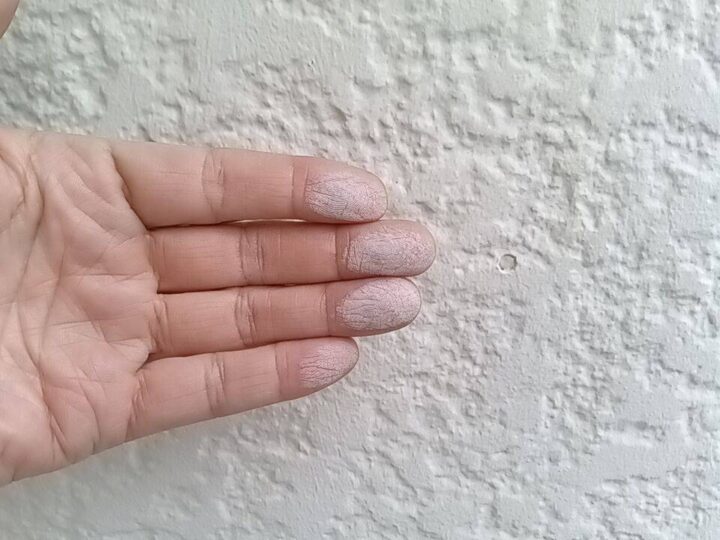 外壁を手で触れると粉が付着する“チョーキング現象”が全体に現れていました。