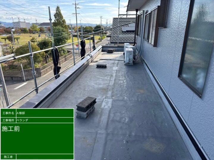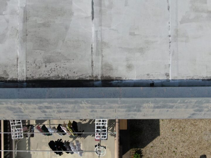 施工前の屋根の状態です。この場所は屋上の外周にある 立ち上がり壁=パラペット にあたります。通常の外壁と違い、パラペットは雨や日光を直接受けやすいため、防水層を守るための保護材(スレートや金属板) を取り付けて仕上げることがあります。紫外線により色褪せが出て防水力が低下しています。