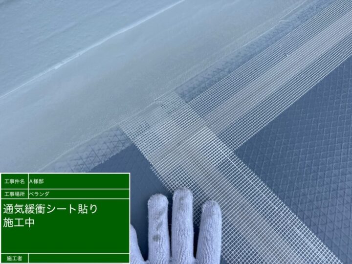 下地の水蒸気や湿気を逃がすための 通気緩衝シート を敷きます。このシートを張る事により、水蒸気が防水層内に閉じ込められず、膨れや破損を防ぎます。