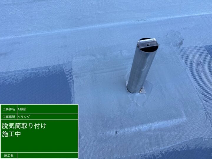 脱気筒は、通気緩衝工法で設置される小さな筒状の部材で、防水層内に発生した水蒸気や湿気を外部へ逃がすための排気口の役割を持ちます。ウレタン防水などの防水層は密閉性が高いため、下地の湿気や施工中の水分が閉じ込められると、防水層が膨れたり剥がれたりする原因になります。脱気筒により、この水蒸気を安全に排出することで、防水層の劣化を防ぎます。
