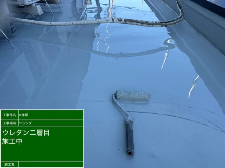 ウレタン樹脂防水材の2回目を塗布していきます。通気緩衝工法では、通気シートの上にウレタンを塗るため、湿気の影響を受けずに均一な防水層が形成されます。