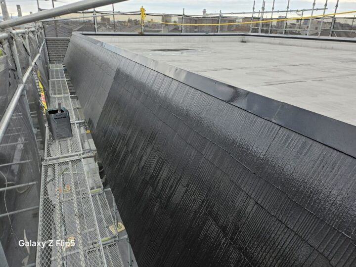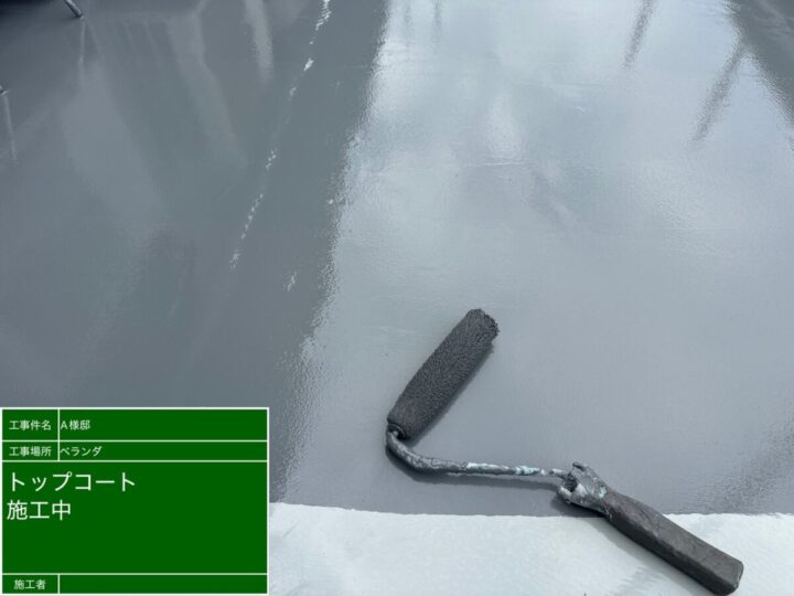 最後に、紫外線や雨風から防水層を守る 保護用トップコート を塗布します。色や耐候性を付加することで、美観と耐久性が向上します。