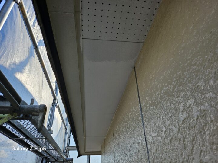 下塗りの乾燥を確認した後、同じくケンエースを上塗りとして2回目に塗布します。上塗りは、塗膜の厚みを確保し、耐久性・防カビ性・美観を高める仕上げ工程です。均一な艶と色合いを出すことで、軒天を長期間きれいに保護します。