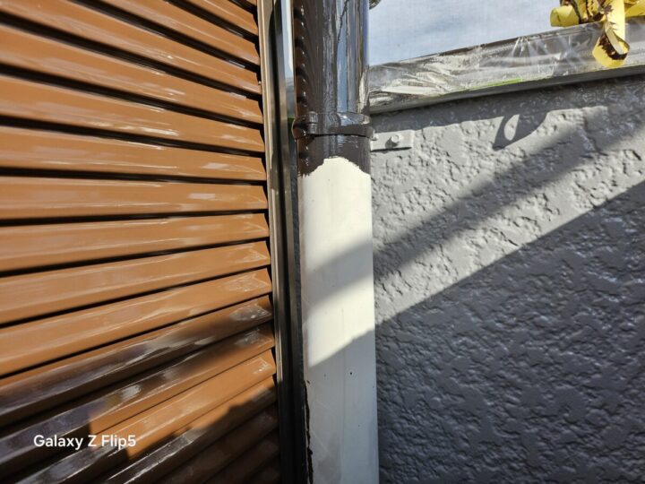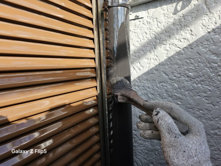 下塗りの乾燥を確認後、同じセミフロンマイルドⅡを上塗りとして施工します。上塗りは、最終仕上げとして美観を整えるとともに、紫外線や雨水などの外的要因から雨樋を長期的に保護します。艶のある均一な塗膜を形成することで、耐候性・防汚性・耐久性に優れた仕上がりとなります。