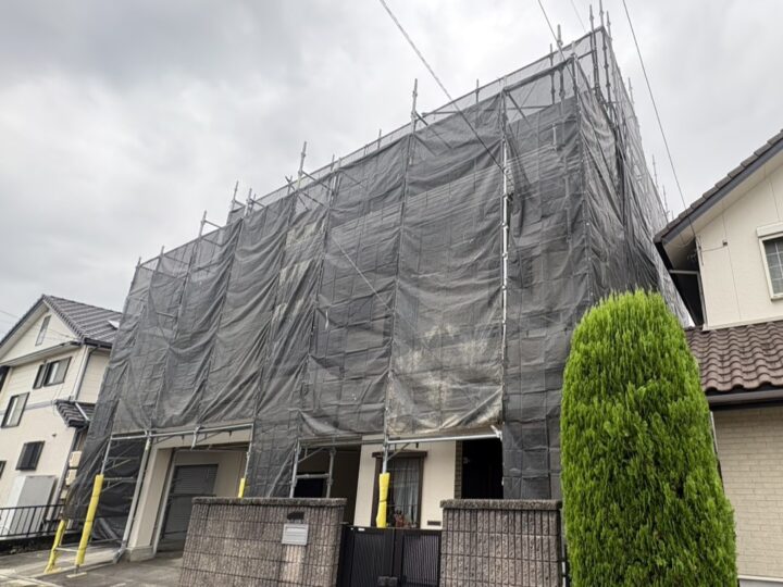 足場を架設し、メッシュシートを張っていきます。足場は作業効率UP、職人の安全確保、塗料や洗浄水の飛散防止などの役割があります。