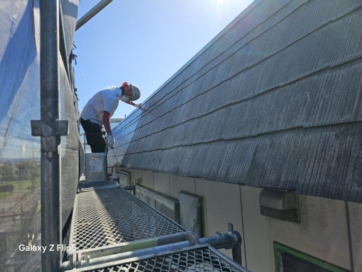 屋根の下塗りとは、上塗り塗料をしっかり密着させるために行う最初の塗装工程です。劣化したスレートは表面が粉を吹いたり弱くなったりしているため、そのまま上塗りをすると剥がれやムラの原因になります。下塗り材(シーラー)を塗ることで屋根材を固め、吸い込みを抑え、上塗りが定着しやすい下地をつくります。つまり、下塗りは塗装を長持ちさせるための“基礎”となる重要な工程です。