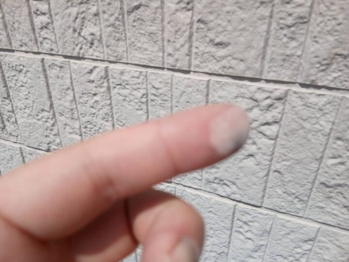 施工前の外壁の状態です。外壁は全体的に色あせとチョーキングが見られ、塗装の防水性・耐候性が低下しています。見た目の美観だけでなく、外壁の保護機能を回復させるためにも、塗り替えが必要な状態です。