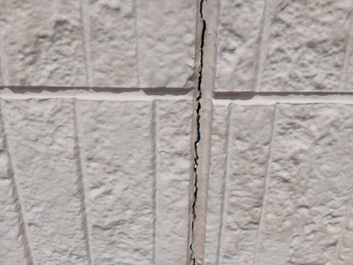 施工前のシーリングの状態です。全体的に硬化が進んでおり、弾力性が失われています。そのため、シーリング材に亀裂が生じている箇所が見られました。経年劣化によって伸縮への追従性が低下しており、防水機能も弱まっている状態です。