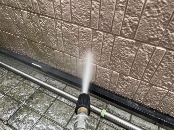 高圧洗浄は、塗料がしっかり密着するための下地処理として重要であり、洗浄不足は塗装の早期剥がれにつながるため、長年の汚れをしっかり圧を掛けて洗い流していきます。