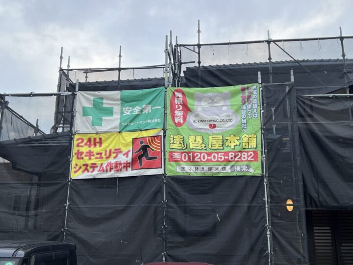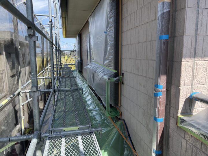 足場を架設し、メッシュシートを張っていきます。足場は作業効率UP、洗浄水や塗料の飛散防止、職人の安全確保などの役割があります。
