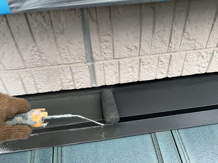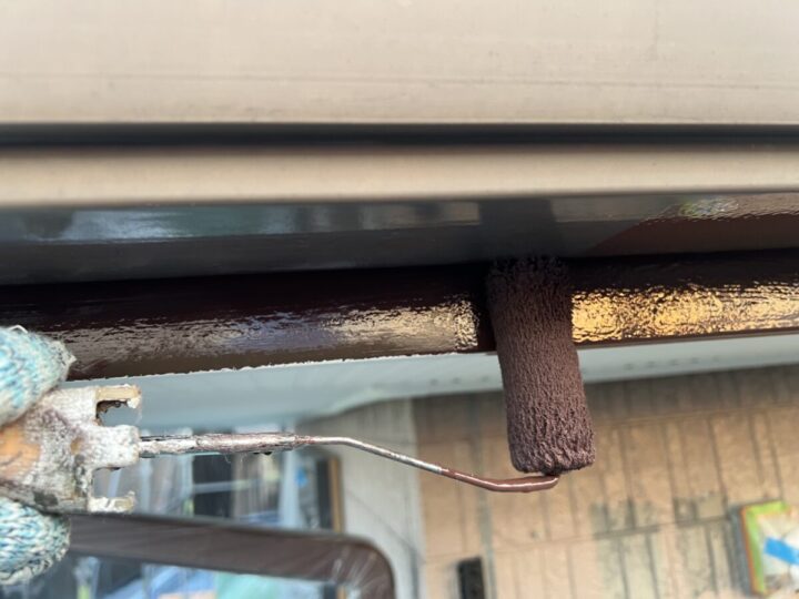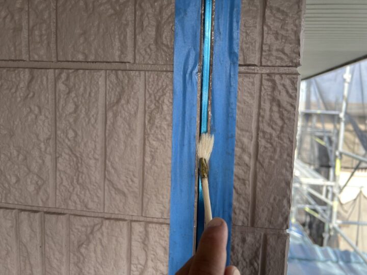 周囲をマスキングで養生し、刷毛でプライマーを塗布していきます。シーリングのプライマー塗布は、シーリング材を下地にしっかり密着させるための重要な工程です。