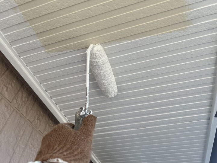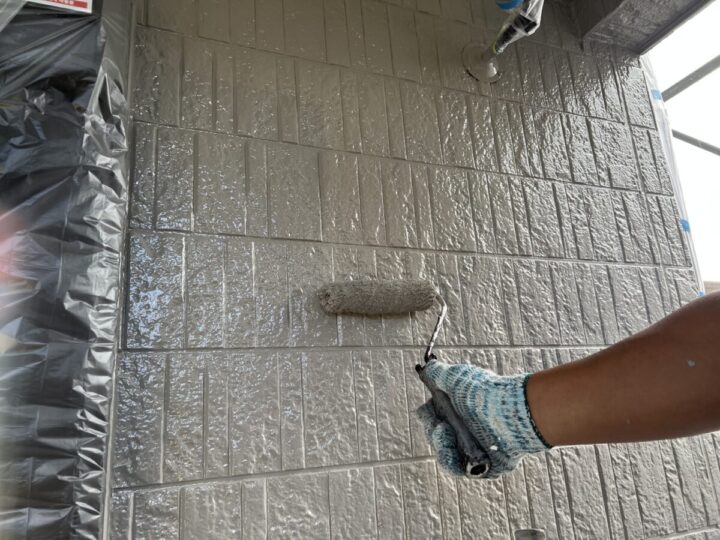 外壁塗装の下塗りは、塗装工程の初めに行う重要な作業で、上塗り塗料の密着性を高め、塗装面を均一に整える役割があります。下塗り剤を塗布することで、外壁の吸い込みを抑え、塗料のムラや剥がれを防止します。適切な下塗りは、仕上がりの美しさと耐久性を大きく左右するため、丁寧に行うことが大切です。下塗り材はKFマイルドシーラーⅡを使用しています。
