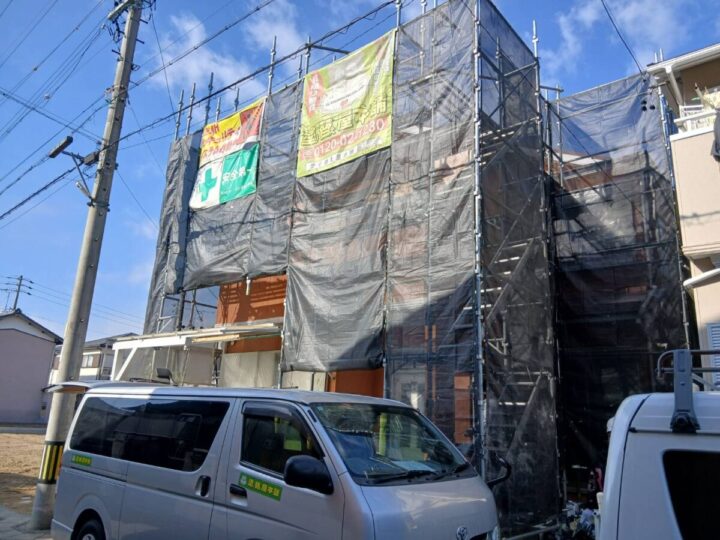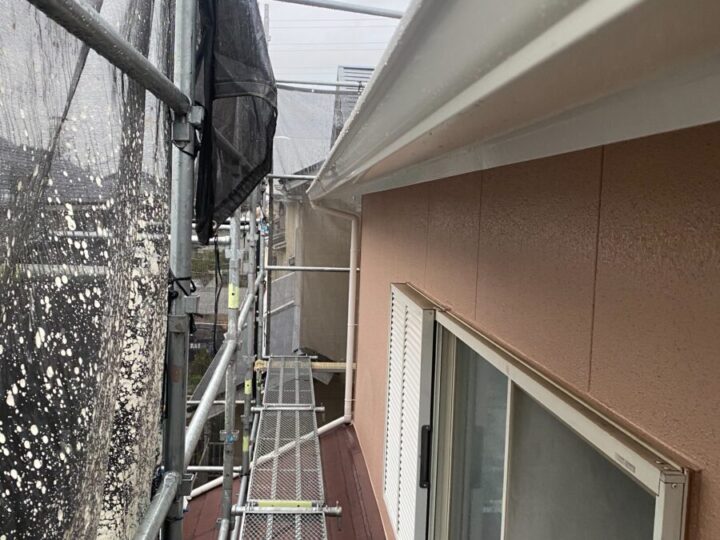 外壁塗装の足場とは、職人が安全に作業できるように建物の周囲に組む仮設の作業台です。高い場所でも安定した姿勢で作業できるため、塗りムラのない丁寧な施工が可能になります。また、足場にはメッシュシートを張り、塗料の飛散を防ぐ役割もあります。外壁塗装の品質と安全性を確保するために欠かせない設備です。