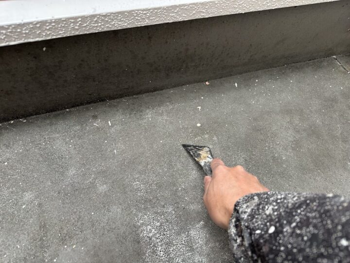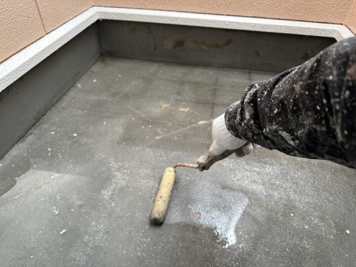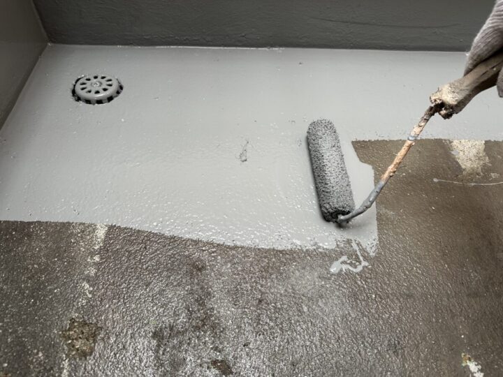 中塗りが完全に乾燥した後、仕上げの工程として「GRトップ」の上塗りを行います。上塗りは中塗りで形成した保護層をさらに補強し、ベランダ全体の防水機能と耐久性を完成させる役割があります。二層にわたって丁寧に塗り重ねることで、日光や雨風、歩行による摩耗から防水層を長期間にわたって守り抜く、強固な塗膜が形成されます。