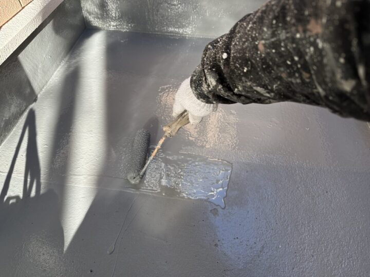 プライマー塗布後、仕上げの第一段階として「GRトップ」の中塗りを行います。中塗りは塗膜に十分な厚みを持たせ、防水層を保護する機能を確立することです。一度の塗装では補いきれない微細な隙間や凹凸を埋めることで、表面を平滑に整え、最終的な仕上がりの美しさと耐久性を大きく向上させます。