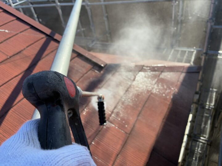 高圧洗浄を行い、長年の汚れを洗い流していきます。汚れが付着したまま塗装を進めてしまうと剥がれなどの原因になってしまいますので業務用のパワーのある洗浄機でしっかり圧を掛け洗浄します。