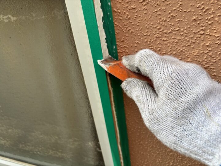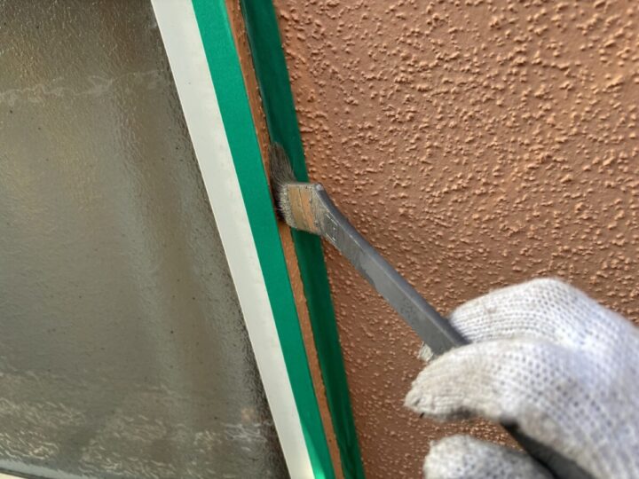 サッシ周りは増し打ちの施工なので、周辺部をマスキングテープにて養生した後、刷毛を用いて下地にプライマーを均一に塗布します。シーリング用プライマーの塗布は、下地とシーリング材との接着性を確保し、長期的な耐久性を左右する重要な下地処理工程です。