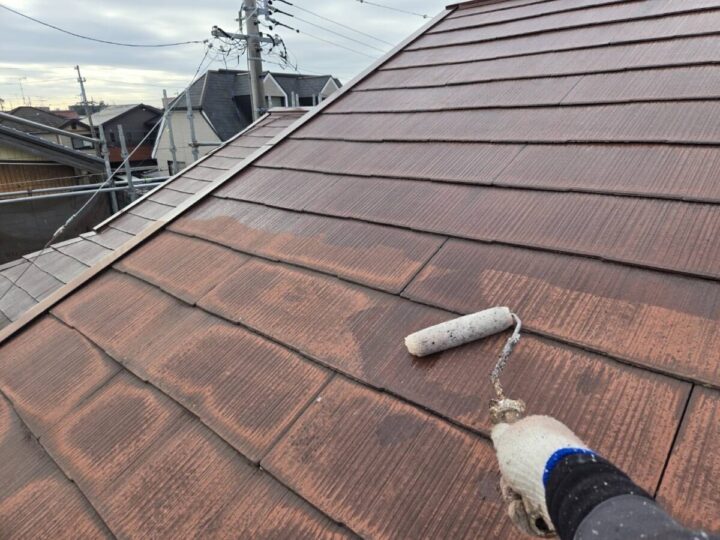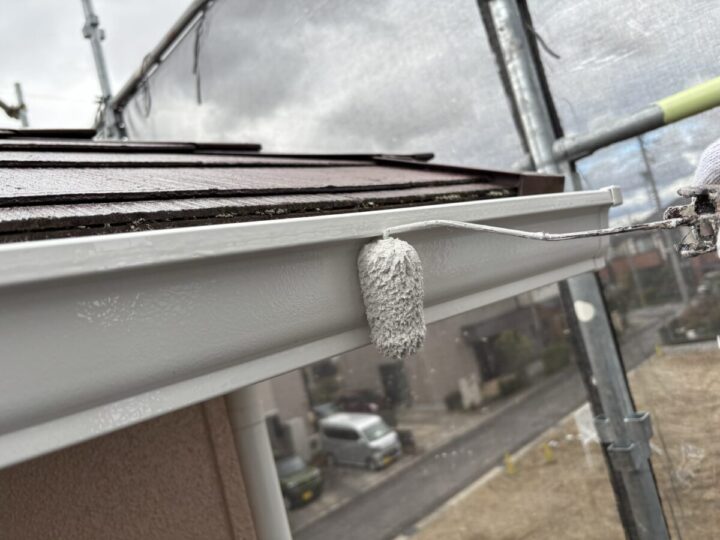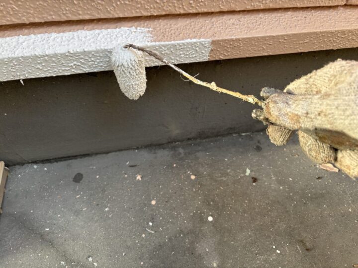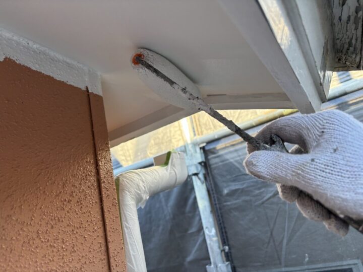 外壁の下塗り同様、塗装工程の初めに行う重要な作業で、上塗り塗料の密着性を高め、塗装面を均一に整える役割があります。下塗り剤を塗布することで、外壁の吸い込みを抑え、塗料のムラや剥がれを防止します。適切な下塗りは、仕上がりの美しさと耐久性を大きく左右するため、丁寧に行うことが大切です。下塗り材はKFマイルドシーラーⅡを使用しています。