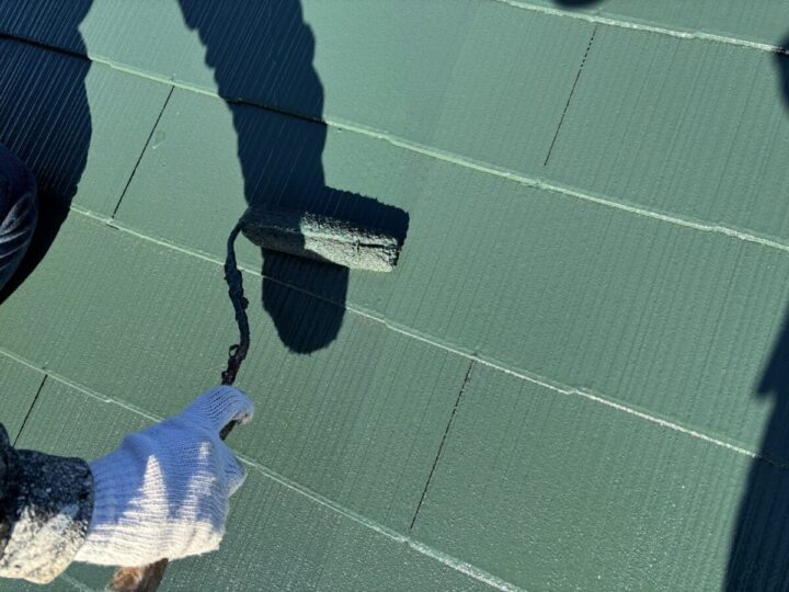 下塗りした後、十分に乾燥させてから上塗りを行います。上塗りも中塗り同様セミフロンスーパーマイルドⅡを使用し、ローラーや刷毛でムラなく均一に仕上げます。下塗りによって吸い込みが抑えられているため、上塗りがきれいにのり、耐久性と美観の良い仕上がりになります。
