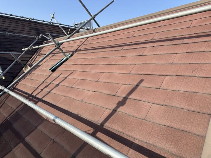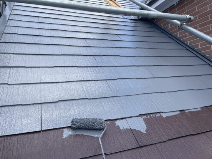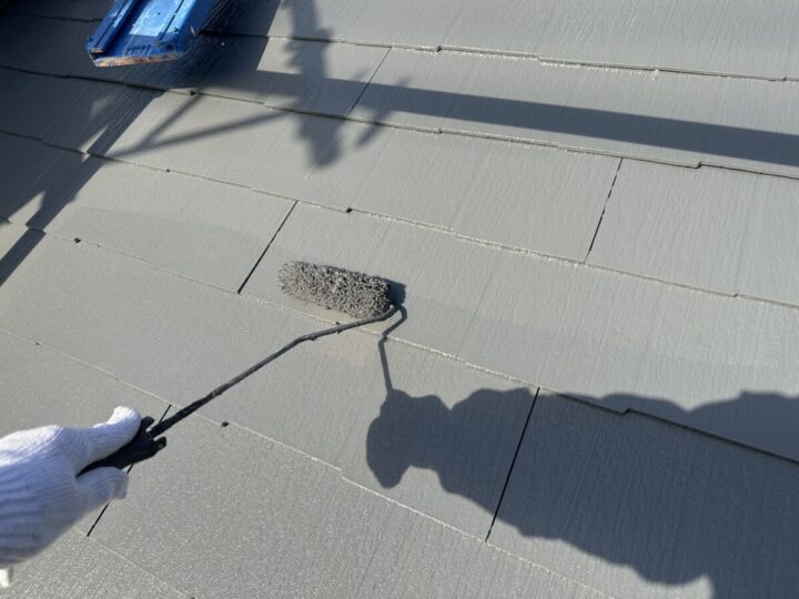 中・上塗りは無機塗料のセミフロンスーパールーフⅡを使用し、中塗りで塗膜に適正な膜厚を付けます。