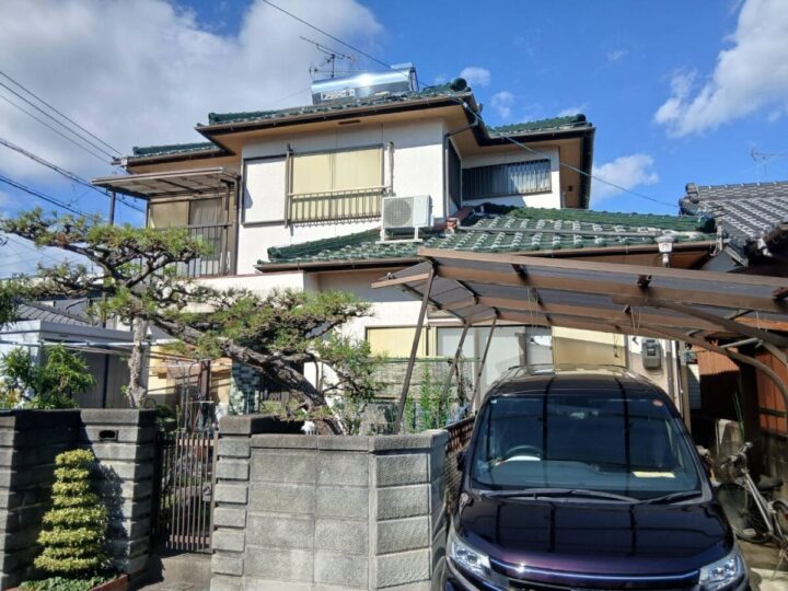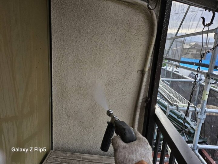 高圧洗浄を行います。古い塗膜や苔、長年の汚れを根こそぎ落とし、塗料の密着度を高めるために不可欠な工程です。この下地処理を丁寧に行うことで、塗り替え後の塗料の剥がれを防ぎ、住まいの美しさを長持ちさせることができます。作業当日は大きなエンジン音や水しぶきが発生するため、近隣への事前告知としっかりとした養生が円滑な施工の鍵となります。