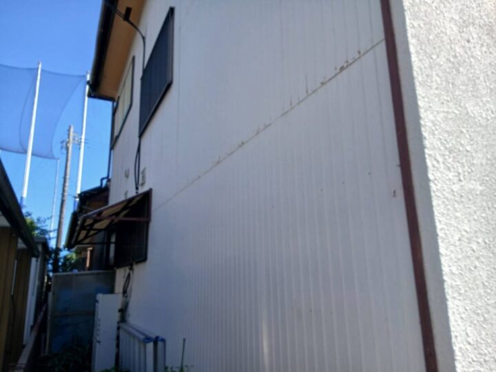 施工前の外壁(トタン)の状態です。色あせやビスのサビが見られます。トタンの色あせは、表面を保護している塗膜が劣化し、防水機能が失われ始めているサインです。これを放置すると、金属特有の『サビ』が発生し、急速に腐食が進んでしまいます。