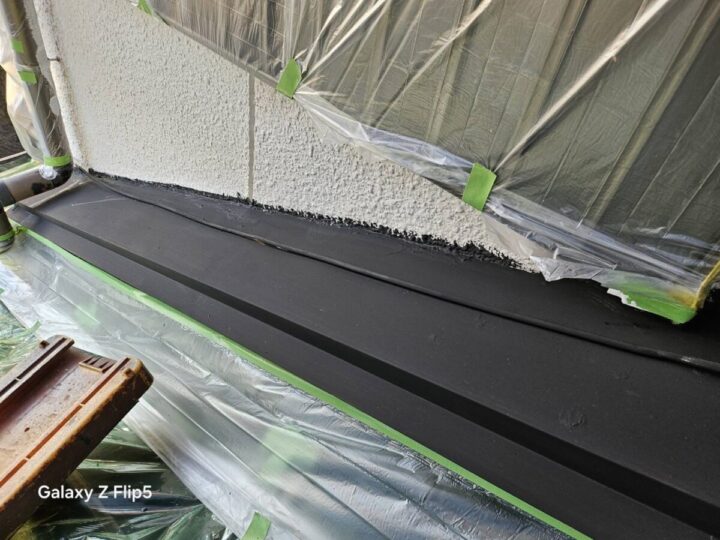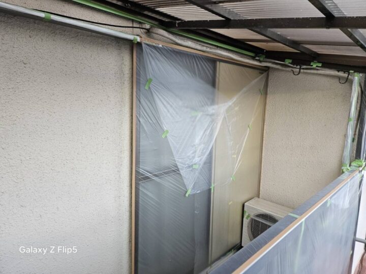 養生は、塗料を塗らない箇所をビニールやテープで保護し、汚れや飛散を防ぐ重要な工程です。窓やドア、エアコンの室外機などを丁寧に覆うことで、美しい仕上がりの境界線(ライン)を作り出し、建物全体の美観を保ちます。