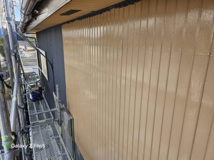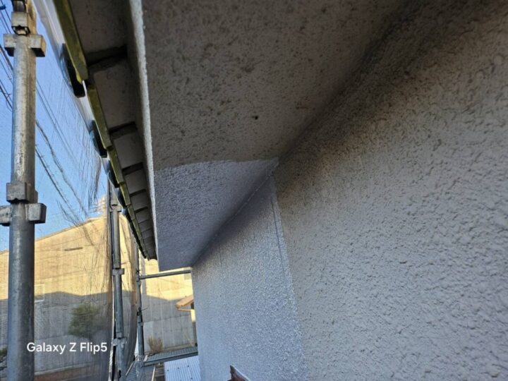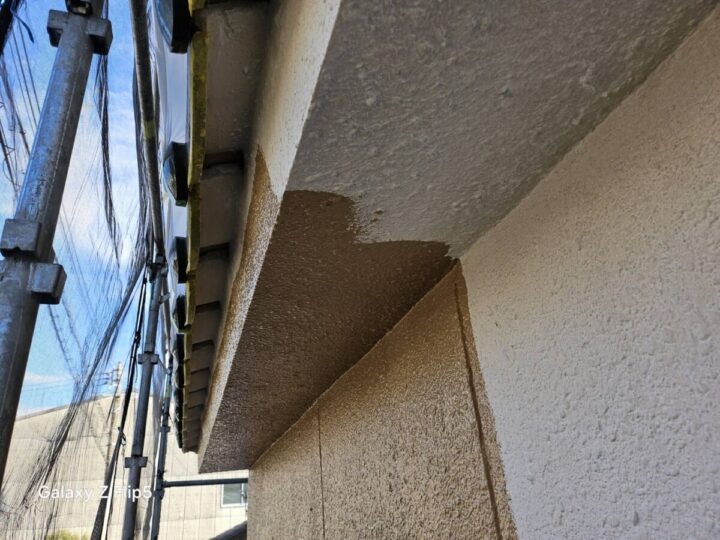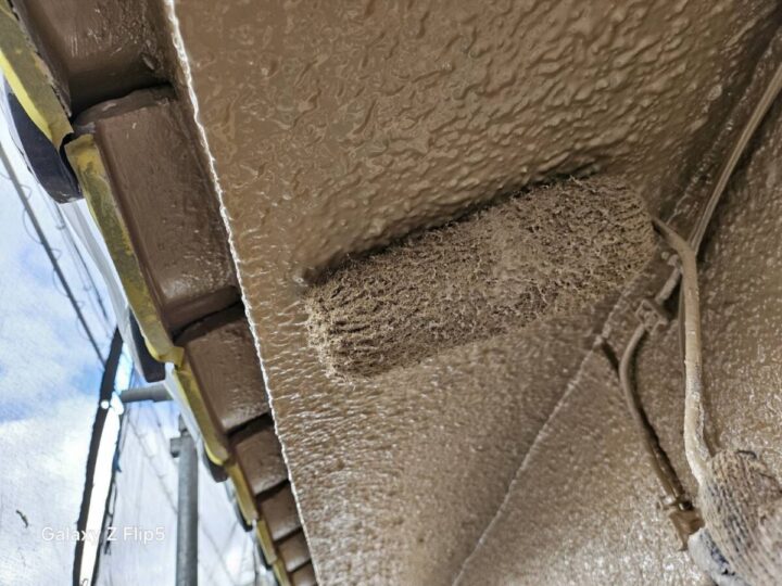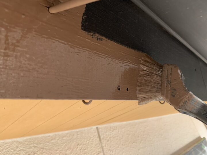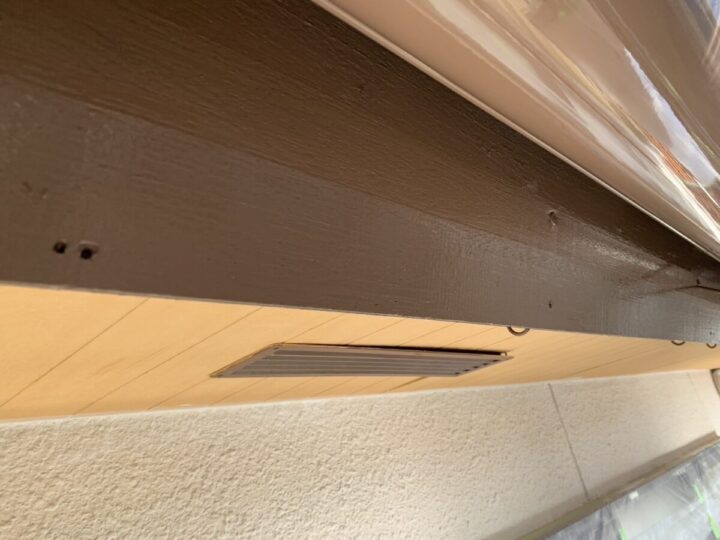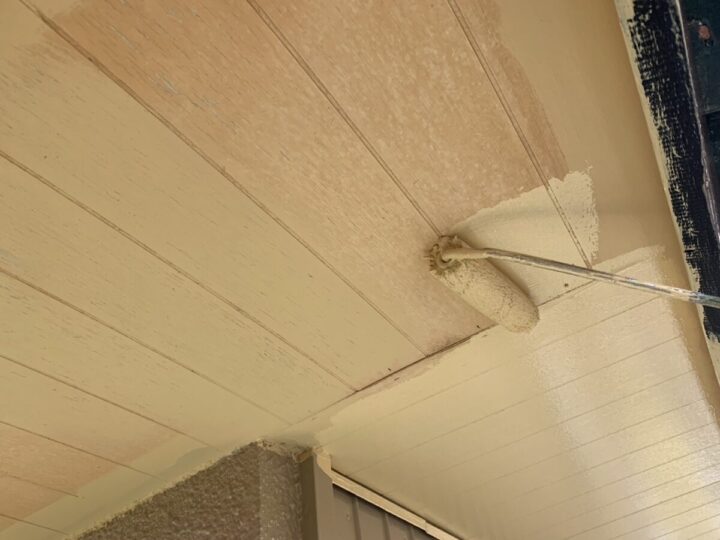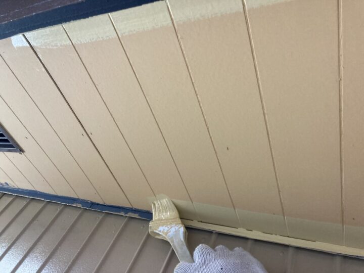 軒天のケンエース上塗りは、つや消しの落ち着いた質感で、建物全体の美観を整える最終仕上げの工程です。透湿性に優れた塗膜を形成することで、内部からの湿気を逃がし、塗膜の膨れや剥がれを未然に防ぎます。2層の厚みを持たせてムラなく塗り上げることで、雨が直接当たらない軒下の清潔感を長期間維持することが可能になります。