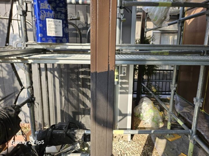 専用のサビ止めプライマーを塗布します。鉄部の腐食(サビ)を根本から抑えつつ、上塗り塗料が剥がれないよう強力に密着させます。