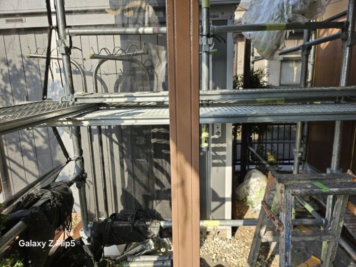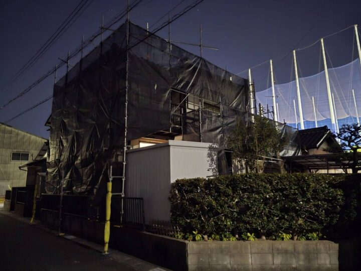 足場を架設し、メッシュシートを張っていきます。足場は、職人の安全を守り、塗りムラのない高品質な仕上げを実現するために不可欠な工程です。頑丈な土台を組むことで、細部まで丁寧な作業が可能になるほか、シートを張ることで近隣への塗料も防ぎます。