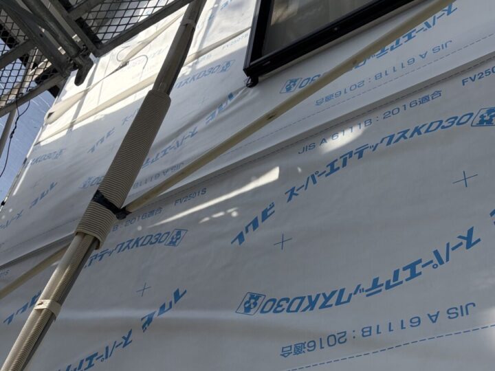 雨水の侵入を防ぎ、内部の湿気を逃がす為に既存外壁の上に透湿防水シートを全面に貼ります。