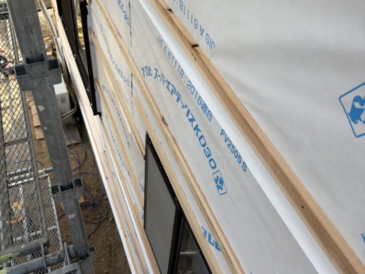 木材を使用し胴縁を取付けます。胴縁の役割は、通気層を確保し湿気を逃がし結露やカビを防ぐことと新しい外壁材をしっかり固定する事です。