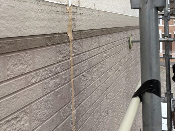 外壁目地は打ち替え・サッシ廻り等は打ち増しで施工します。画像は外壁目地の既設のシーリング材を撤去している様子です。