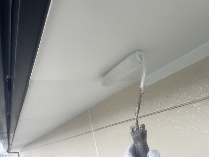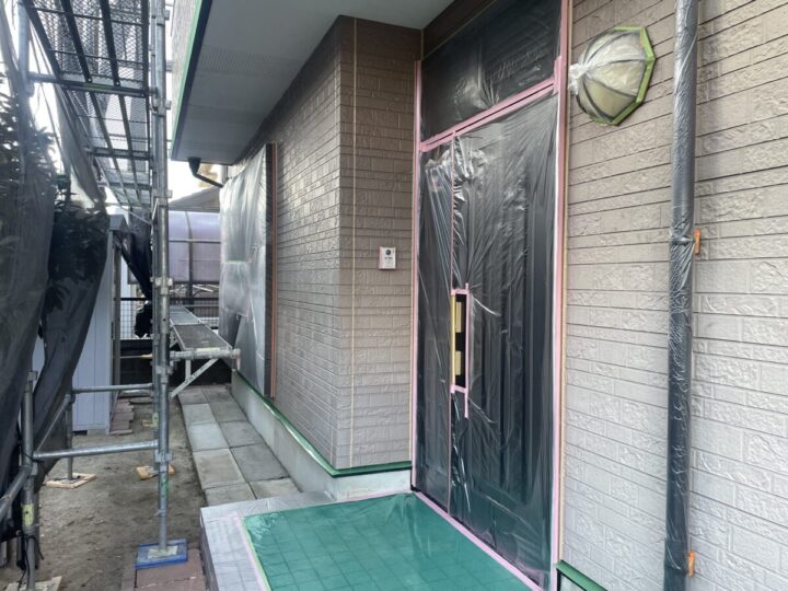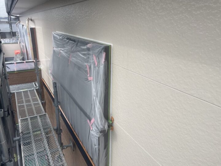 塗装しない部分に塗料がつかないよう、マスカー等で丁寧にカバーしていきます。窓やドア、設備などをしっかり保護することで、きれいな仕上がりにつながります。細かい作業ですが、仕上がりを左右する重要な工程です。