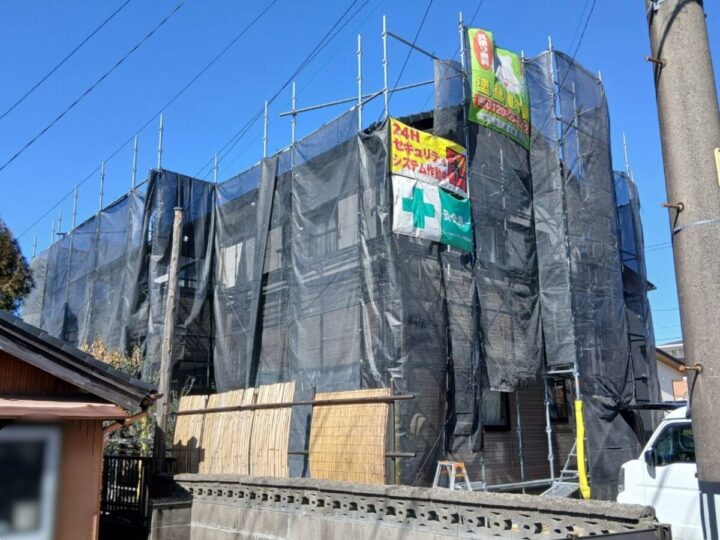 外壁塗装工事の初日は、作業の安全性と品質を確保するために足場の設置からスタートします。しっかりとした足場を組むことで、職人が安定した姿勢で作業でき、塗りムラや施工不良の防止にもつながります。また、周囲への塗料の飛散を防ぐため、養生ネットを設置します。