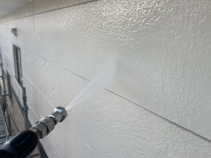 高圧洗浄機を使用して外壁に付着した汚れやカビ、コケ、古い塗膜をしっかり洗い流します。この工程を丁寧に行うことで、塗料の密着性が高まり、仕上がりの美しさや耐久性が大きく向上します。見えない部分こそ、しっかりと下地処理を行うことが大切です。